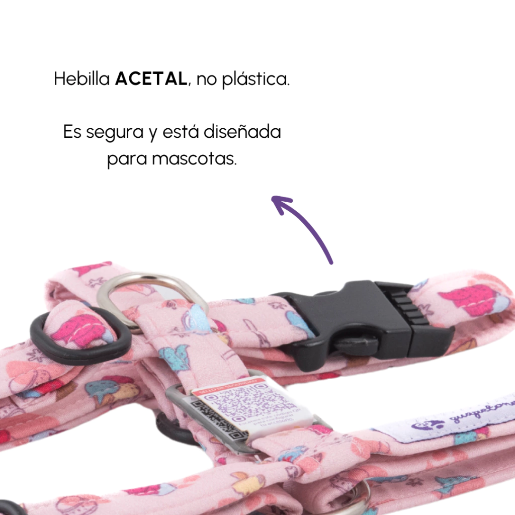 Pretal H realizado en una resistente cinta de poliéster envuelta en tela de microfibra. Nosotros diseñamos todos nuestros productos y son inspirados en nuestros perrhijos. Mas info aqui.